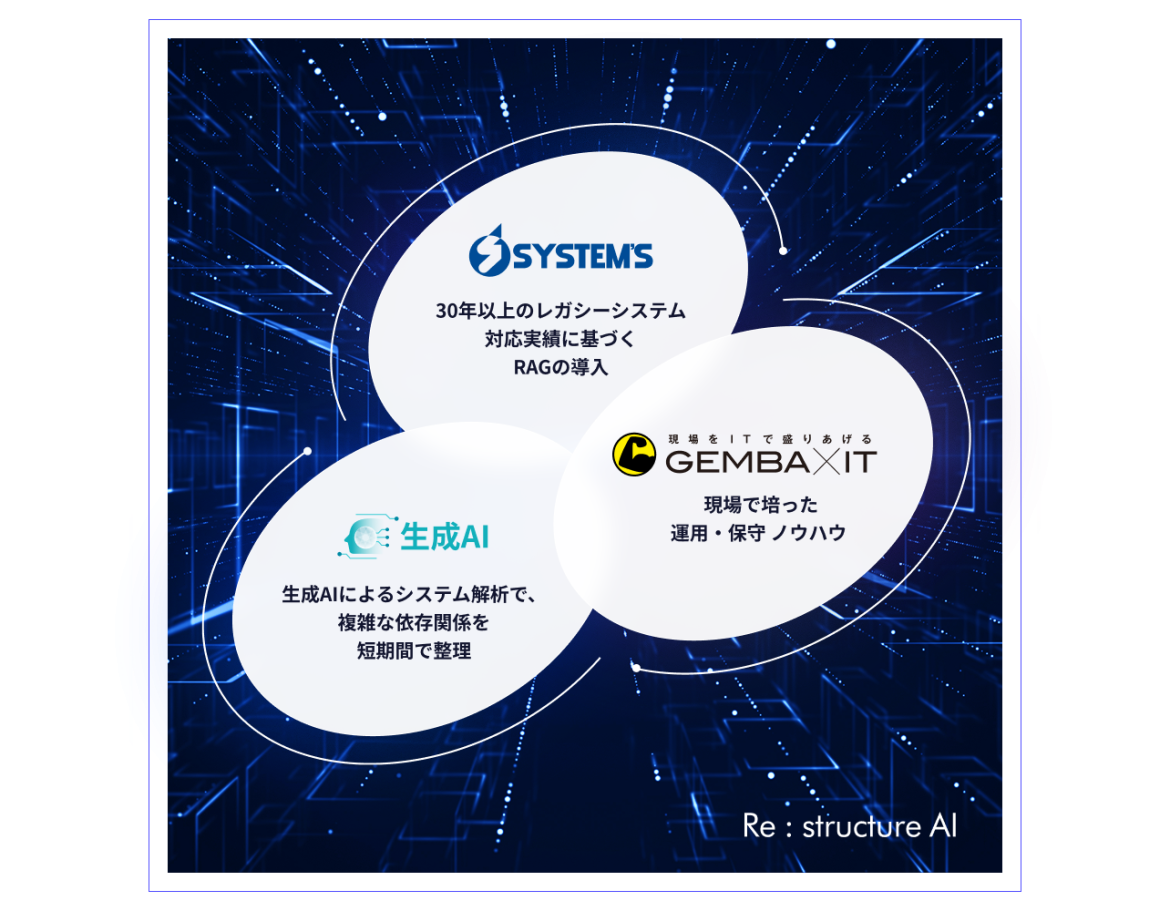 2025年10月17日(金)より、生成AIを活用してブラックボックス化した企業のレガシーシステムを解析・可視化し、属人化リスクの解消と刷新コストの削減を実現する新サービス「Re:structure AI(リ・ストラクチャー・エーアイ)」の提供を、開始したことをお知らせいたします。