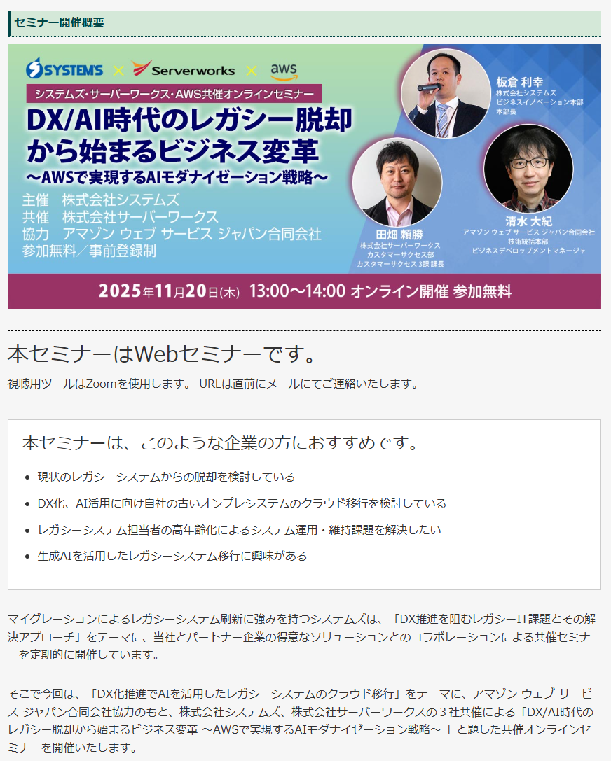 ITリノベーションとマイグレーションを事業展開する システムズは、来る 2025年 11月20日(木)に、株式会社システムズ、株式会社サーバーワークス、アマゾン ウェブ サービス ジャパン合同会社の3社共催による無料オンラインセミナー、