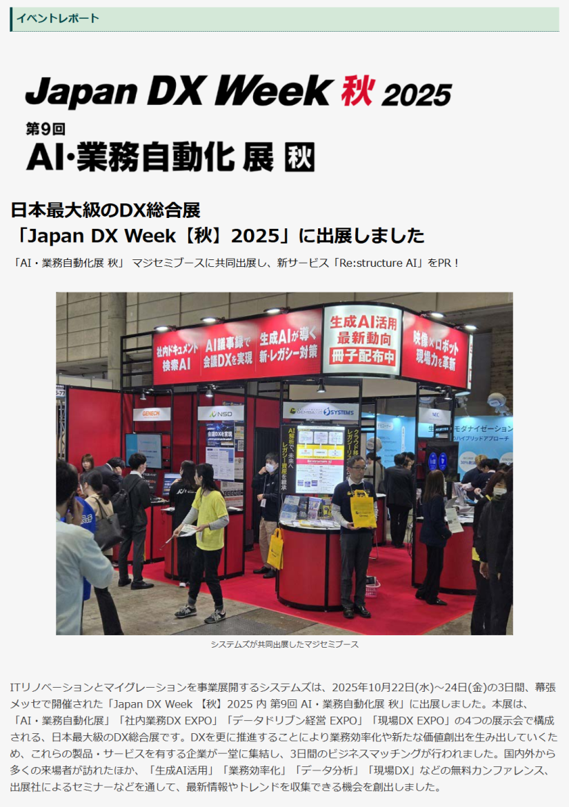 ITリノベーションとマイグレーションを事業展開するシステムズは2025年10月22日(水)~24日(金)の3日間、幕張メッセ 1~8ホールで開催された 日本最大級のDX総合展示会「Japan DX Week 【秋】内「第9回 AI・業務自動化展【秋】」内 マジセミブースに共同出展した際の、展示会出展レポートを公開しました。今回もシステムズは、DX推進を妨げるレガシーシステム問題にフォーカスし、オンプレミスからのクラウドリフト課題で悩む企業に向け、統合型ソリューション ITリノベーションからAWSクラウドマイグレーション、VBマイグレーションなどのマイグレーションに基づく当社独自の技術とITサービス、および来場者向け「VB資産可視化無償棚卸キャンペーン」を紹介しました。