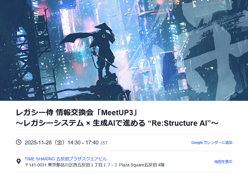 ITリノベーションとマイグレーションを事業展開する システムズは、来る 2025年 11月28日(金)に、日本のレガシーIT環境を「最後尾から支える」ことをミッションとする人材コミュニティ「レガシー侍」のリアルイベント「第3回 レガシー侍 情報交換会 MeetUP3」を開催いたします。