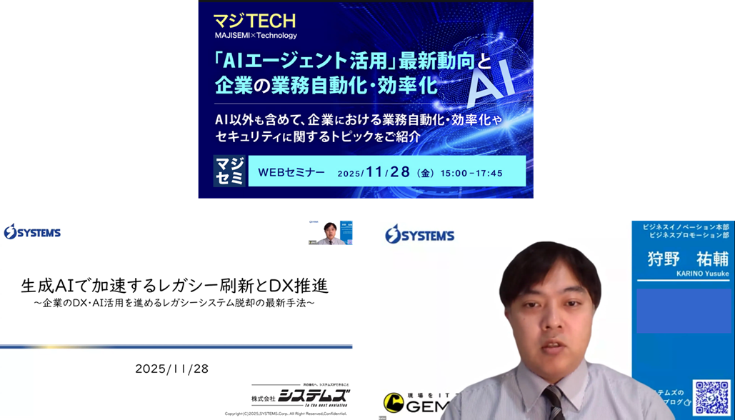 ITリノベーションとマイグレーションを事業展開する システムズは、去る2025年 11月28日(金)に、マジセミ主催により開催されたオンライン・イベント マジTECH『「AIエージェント活用」最新動向と、企業の業務自動化・効率化」』にて、「生成 AI で加速するレガシー刷新と DX 推進」と題したスポンサーセッションを担当し、登壇しました。