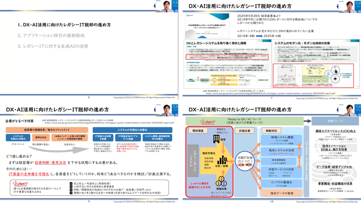 また、今回のアジェンダは、1.レガシーIT脱却の現状と課題、2.アプリケーション移行の最新動向、3.レガシーITに対する生成AIの活用の3つのセクションで構成されており、初めにDX、AI 活用に向けたレガシー IT 脱却の進め方について説明。2025年の崖に関する経済産業省のレポートを引用し、現在も約6割の企業でレガシーシまステムが課題となっていることを説明しました。特に、データの部門間分断、最新技術との互換性の低さ、セキュリティリスク、保守コストの増大などの具体的な問題点を指摘しました。
