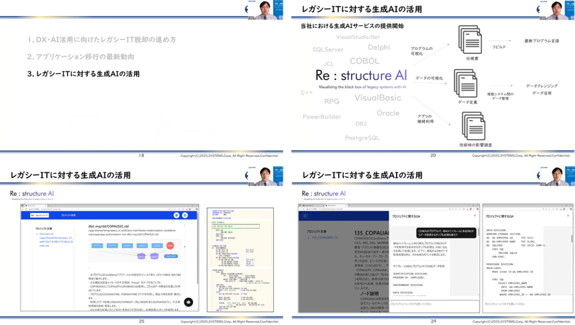 セッションの最後は、レガシーITに対する生成AIの活用と題し、自社開発のRe:Structure AI(リ ストラクチャー エーアイ)サービスを紹介し、レガシーシステムの可視化における生成AIの具体的な活用方法をデモ画面を交え詳しく紹介しました。特に、ソースコードの自動解析、システム全体の俯瞰図の生成、AIチャットによる質問応答機能などの特徴を詳しく解説しました。