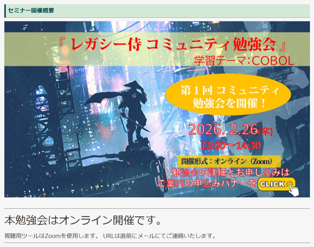 ITリノベーションとマイグレーションを事業展開する システムズが事務局を務める、コミュニティ『レガシー侍』は、来る 2026年 2月26日(木)に、日本のレガシーIT環境を「最後尾から支える」ことをミッションとする人材コミュニティ「レガシー侍」のオンライン勉強会「第1回 レガシー侍 コミュニティ 勉強会 /テーマ:COBOL」を開催いたします。
