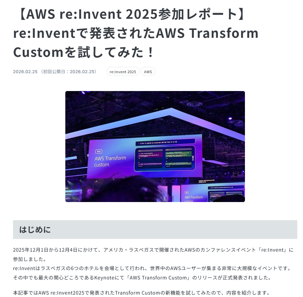 今回の記事では、技術的負債の解消とコードのモダナイゼーションを劇的に加速させる新エージェント**「AWS Transform Custom」**をピックアップ。