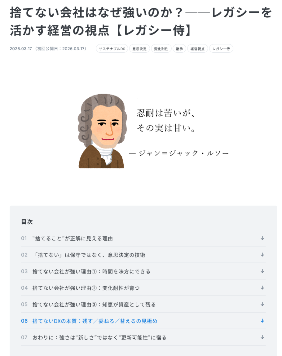 コラム「レガシー侍」シリーズでは、**「捨てない会社はなぜ強いのか?──レガシーを活かす経営の視点」**と題し、DX時代における既存システムの価値再評価について詳しく解説しています。