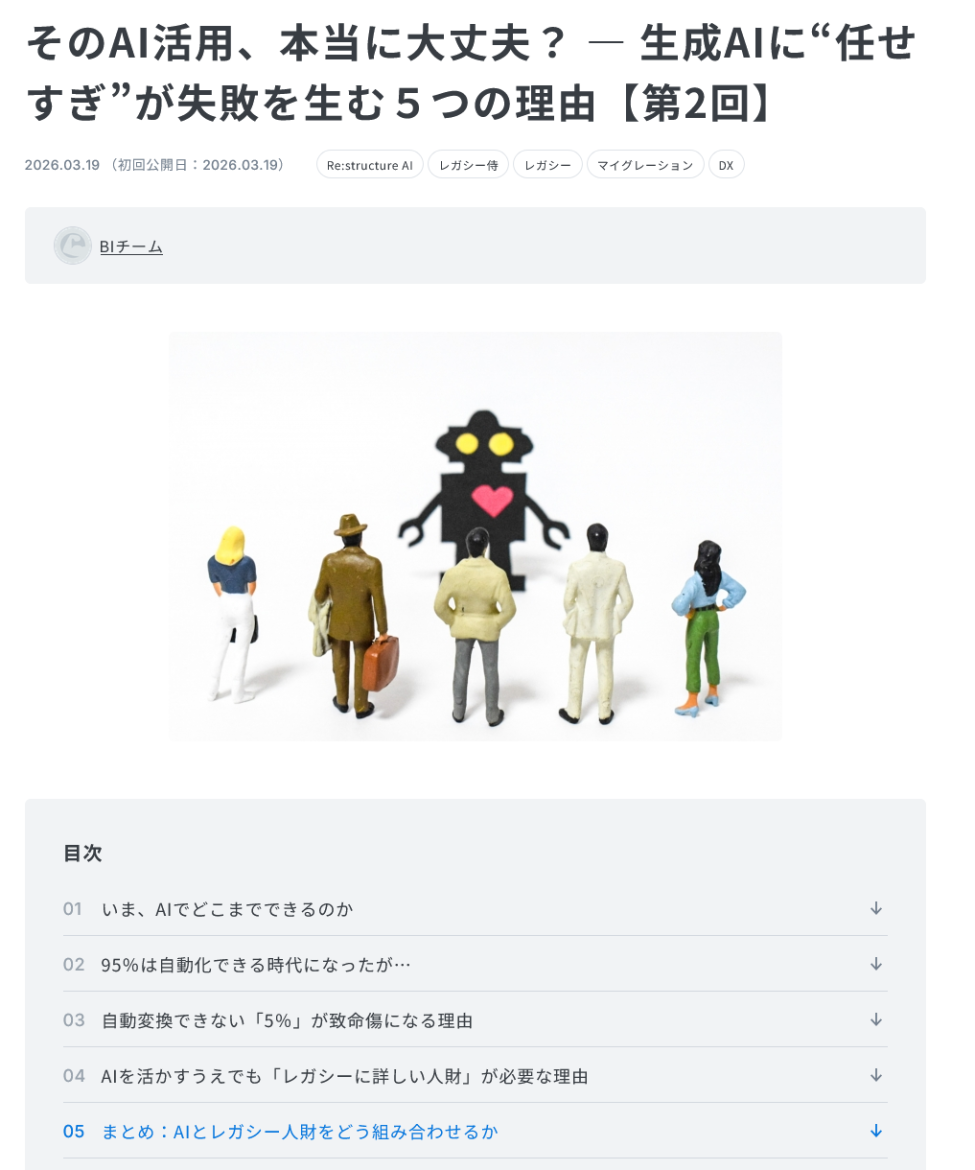 ▼掲載コラム記事の全文はこちらからVol.178 そのAI活用、本当に大丈夫? ― 生成AIに“任せすぎ”が失敗を生む5つの理由【第2回】■システムズのマイグレーション コラム一覧はこちらから →→→