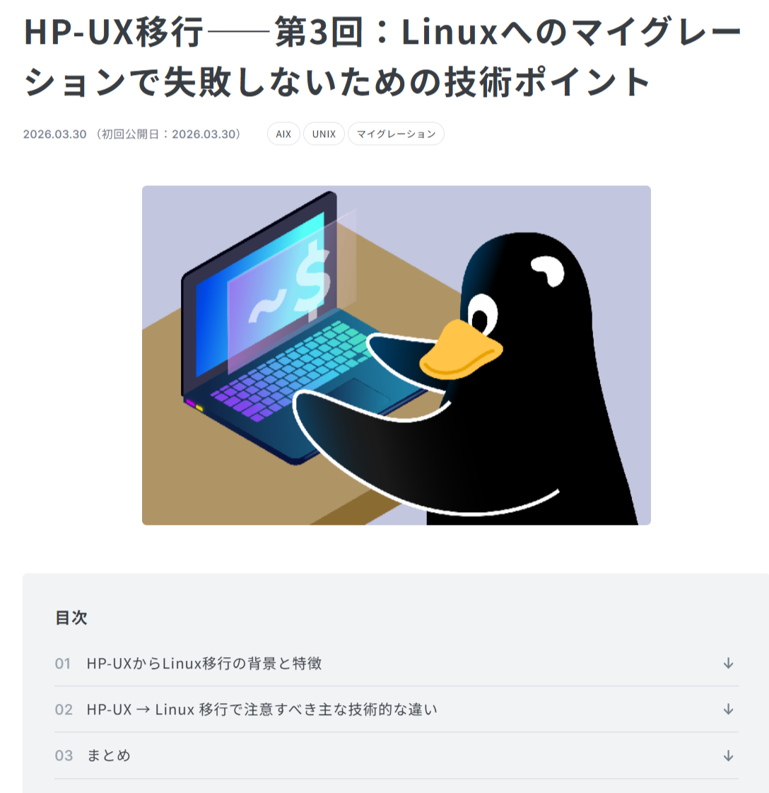 最新コラム「HP-UX移行――第3回:Linuxへのマイグレーションで失敗しないための技術ポイント」を公開いたしました。