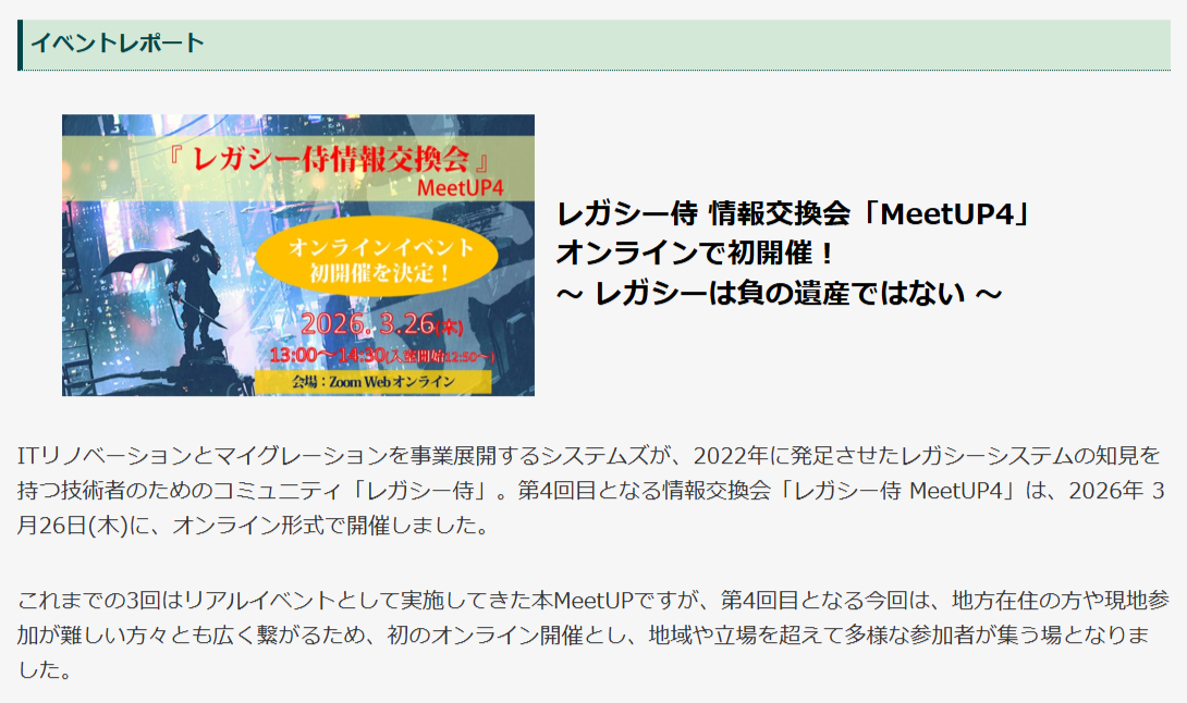 ■ レガシー侍 情報交換会「MeetUP4」開催レポートはこちらからご覧いただけます。↓↓↓
