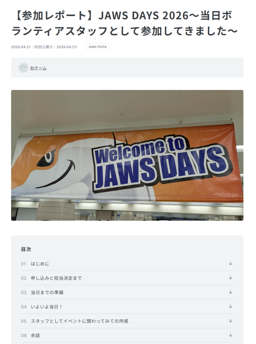 ▼コラム記事本編はこちらから↓↓↓【参加レポート】JAWS DAYS 2026~当日ボランティアスタッフとして参加してきました~システムズのオウンドメディア「Techブログ」サイhttp://トには、当社のシステムエンジニアが執筆する、マイグレーションや物流業務をはじめ、最新のITトレンドに関するシステムズ視点による技術コラムを、随時 掲載しています。